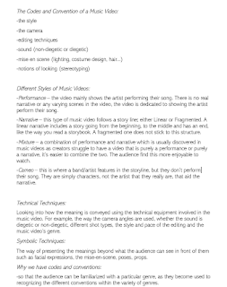 I looked into the codes and conventions of a music video to ensure I am following the correct structure for the music video I am aiming for. By looking into aspects such as the mise-en-scene I am able to ensure the artist is being portrayed to the audience in the manner I want.